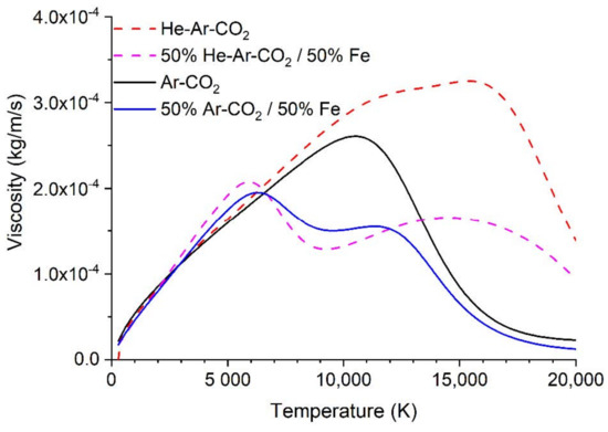 The binary blend arc is longer, as can be seen by comparing Figure 2 and Figure 3. This implies the velocity and temperature will be lower near the workpiece. The value of ρh will be similar, but we can use vz = 50 m/s, which yields σ = 3.4 mm. The lower vz is justified by the similar viscosity (Figure 16) for the two gas mixtures in the presence of iron vapor. The viscosity determines the radial spread of the flow momentum—a high viscosity leads to a more rapid decrease in the velocity as the distance from the wire increases. Thus, we estimate the arc radius is 30% smaller for the ternary blend than for the binary blend.