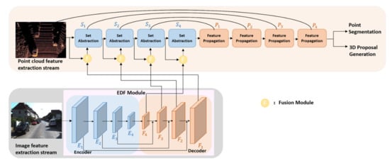 The point cloud feature extraction stream takes LiDAR point clouds as input and generates the 3D proposals. Considering the tradeoff between the performance and computation time, the geometric stream uses four pairs of Set Abstraction (SA) layers [11] and Feature Propagation (FP) layers [11], for point-wise feature extraction. For the convenience of description, the outputs of SA and FP layers are denoted as and (I = 1,2,3,4), respectively. As shown in Figure 1, the point feature map Si is combined with the semantic image feature in our fusion module. In addition, the point feature is further enriched by the multi-scale image feature functional units to obtain a compact and discriminative feature representation, which is then fed to the detection modules for foreground point segmentation and 3D proposal generation.
