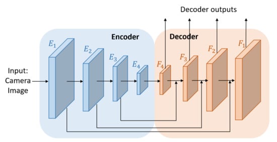 The camera RGB images are processed by an Encoder-Decoder Fusion (EDF) module as shown in Figure 2. The EDF module consists of a set of convolution and deconvolution layers. The encoder module uses four convolution blocks to reduce the resolution of the feature maps. Then, the feature maps in the decoder are up-scaled via deconvolution layers and then combined with the corresponding feature maps of the same resolution in the encoder through element-wise accumulation.