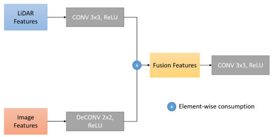 We can easily associate image features with LiDAR features by using the fusion module. Specifically, we use a 3 × 3 CONV layer and a ReLU activation function as a point-wise feature processor. The point-wise feature processor takes LiDAR point clouds and the camera images under the same resolutions and produces the point-wise correspondence between them. A 2 × 2 deconvolution layer and a ReLU activation function are used in the image feature processor. The point-wise features and the image features are fused by element-wise consumption to obtain fusion features. Finally, we apply a 3 × 3 convolution and a ReLU activation function to resize the feature.