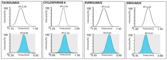 With regard to Shimadzu–Recipe, the cumulative chromatogram of tacrolimus, cyclosporine A, sirolimus, and everolimus (Figure 1) shows all of the used mass transitions, and the corresponding retention times for each substance. Representative chromatograms obtained with the Cascadion are also shown for each analyte (Figure 1).