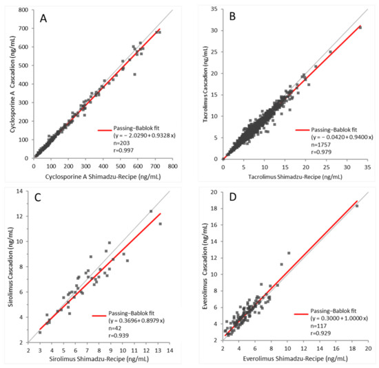 A good correlation between the two methods was observed. Moreover, it can be noted that for all four analytes there are strong correlation values without significant variations from linearity as the correlation coefficients for cyclosporine A (0.997), tacrolimus (0.979), sirolimus (0.939), and everolimus (0.929) show. A good correlation, however, was expected as both the methodologies are based on LC-MS/MS analysis which is the gold standard for immunosuppressant analysis.