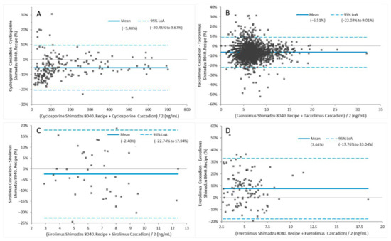 Bland−Altman plot for cyclosporine A (A), tacrolimus (B), sirolimus (C), and everolimus (D). In each plot, the mean and the limit of acceptance (LoA) are indicated.