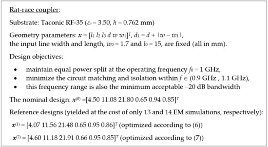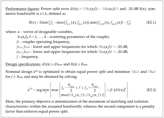 In antenna and microwave designs, performance requirements are frequently formulated in a minimax form, i.e., by setting upper/lower acceptance levels on the electrical characteristics of the device at hand. These may include maximum in-band reflection (antennas) or maximum power split error within the operating band (couplers) [9]. As a consequence, a commonly utilized figure of merit is the yield [4], i.e., the percentage of designs for which the target specifications are met given the assumed deviations of the parameters. Figure 1 and Figure 2 show two examples of the design optimization tasks of high-frequency devices: a multi-band antenna and a microwave coupler. The figures provide the design specifications, as well as the formulations of the respective objective functions. For the antenna, the nominal design has to ensure the best possible matching within the operating bands of interest, whereas in the case of the coupler, the aim is to ensure equal power split and to improve the bandwidth. Typically, the nominal designs serve as a starting point for yield optimization.