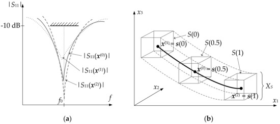 Yield optimization of microwave couplers by means of performance-driven surrogates: (a) scattering parameters of an exemplary coupler at the nominal design x(0), design x(1) (spoiled power split), and design x(2) (improved –20 dB bandwidth); for clarity, only the selected S-parameters are shown for x(1) (|S21|, |S31|) and x(2) (|S11|, |S41|). These designs determine the directions of the most significant response changes (from the point of view of yield manipulation). (b) The designs x(0) to x(2) form a parameterized surface S(t). The union of intervals SI(t) (cf. (21)) forms surrogate model domain XS.