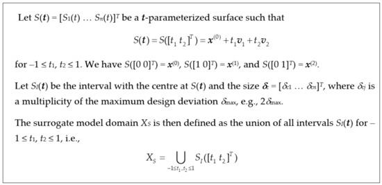 Surrogate domain XS is small volume-wise, yet it is ample enough to encompass the directions of essential changes of the coupler responses affecting its yield. As in the previous case (Section 3.1), a small volume of the domain allows a significant reduction in the cost of setting up the surrogate, and also—due to the mentioned coverage of important directions—there is no need to iterate the entire process (as in Algorithm 2). The yield optimization process is conducted by solving (3), i.e., similarly as in the algorithm of Section 3.1.
