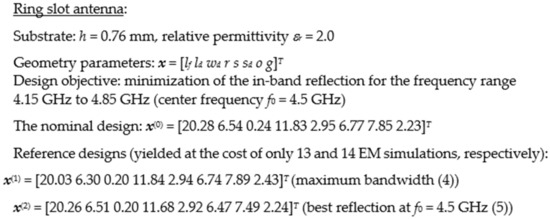Figure 7 shows our first verification structure: a ring slot antenna, for which its circular ground plane featuring a slot with defected ground structure is excited through a microstrip line [67], whereas all the pertinent details are provided in Figure 8. We assumed independent uniformly distributed parameter deviations with maximum deviation δmax = 0.05 mm. The yield optimization results are provided in Table 2 for the algorithm of Section 3.1 and the benchmark surrogate-assisted procedures of Table 1. For the discussed approach, the size of the metamodel domain was set to δc.k = 2δmax (see Figure 3); the training data set for constructing the surrogate contained 35 samples; and its relative RMS error equals 0.5%.