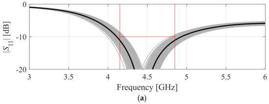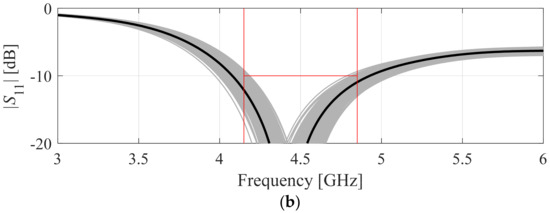 Monte Carlo analysis of antenna of Figure 7 using EM simulations (gray plots): (a) nominal design; (b) yield-optimized design obtained using the algorithm of Section 3.1. Black plots show the antenna response at the nominal and optimized designs, respectively.