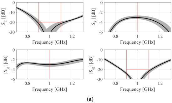 As mentioned earlier, the evaluation of the effects of parameter tolerances involves statistical analysis [13,14]. For reliability, it is normally carried out using full-wave electromagnetic (EM) analysis, which is associated with significant computational costs. Nevertheless, it is mandatory whenever simpler models (e.g., equivalent circuits) fail insufficiently to account for cross-coupling and similar effects [15,16,17,18]. Improving the computational efficiency of statistical analysis can be achieved using simplistic yet inaccurate methods (e.g., worst-case analysis [19,20,21]) or surrogate-assisted techniques [22,23], where repetitive EM simulations are replaced by an evaluation of a fast replacement model, usually prepared beforehand. Popular modeling methods include polynomial approximation [24], neural networks (NNs) [25,26], or polynomial chaos expansion (PCE) [27,28,29,30,31,32,33]. Despite their advantages, surrogate-based methods are affected by the curse of dimensionality, resulting in excessive costs of model rendition for more complex systems. The alleviation of these difficulties is partially possible by the employment of hybrid techniques (e.g., PC kriging [6,34,35]), dimensionality reduction [36], multi-resolution methods (space mapping [37,38,39,40] and co-kriging [41,42]), or model order reduction [43].