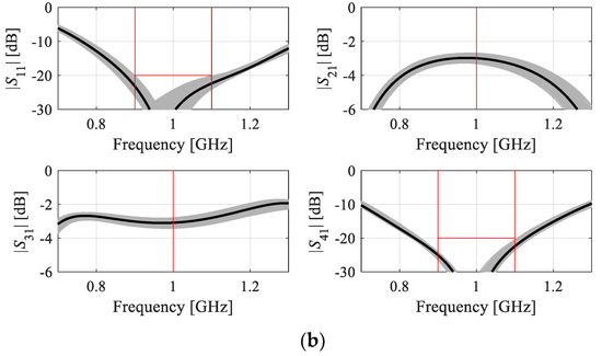 Monte Carlo analysis of the coupler of Figure 10 using EM simulations (gray plots): (a) nominal design; (b) yield-optimized design obtained using the algorithm of Section 3.2. Black plots show the antenna response at the nominal and the optimized designs, respectively.