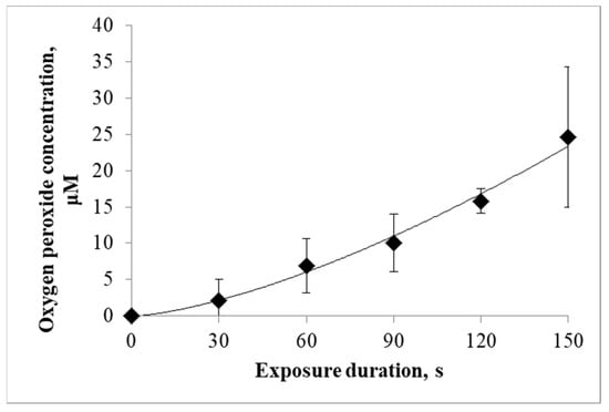 Dependence of oxygen peroxide concentration in the physiological solution on the processing time by direct piezodischarge. The distance between the piezotransformer and the solution surface was 0.5 mm. The temperature of the surrounding medium was 20 ± 2 °C, and the air humidity was 70 ± 3%. In detail, the experimental conditions are described in the Section 2.