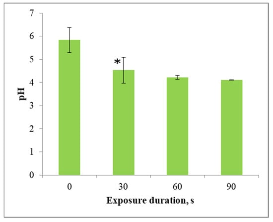 Changes in the pH of the physiological saline after exposure to piezoelectric direct discharge of variable duration. An asterisk * indicates a statistically significant difference (p < 0.05) from the control.