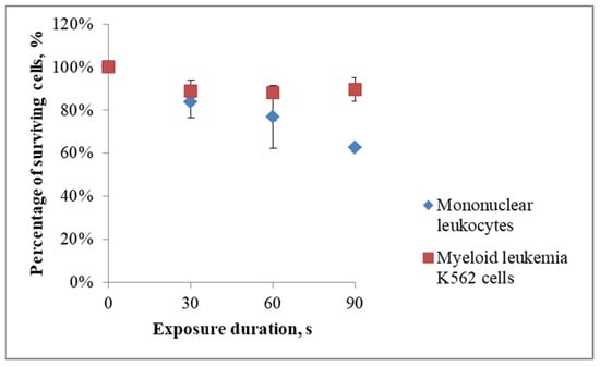 In the studied time range for the processing of the physiological solution by direct piezodischarge, the vitality of myeloblastosis cells decreased, at maximum, to 88% (Figure 7), which not a clinically significant result, and it did not exhibit direct correlation with the processing time. The vitality of mononuclear leucocytes decreased proportionally to the processing time to 63%, at processing time of 90 s.