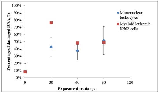 Figure 8 shows the level of damage to the DNA at different processing times by the direct peiozodischarge of the physiological solution added to the nutritional medium. The selectivity of DNA damage of mononuclear leucocytes and mieloblastosis cells is seen when the processing time is 30 s. The maximum level of DNA damage of the mononuclear leucocytes is 51% at processing time of 90 s, and the maximum damage of mieloblastosis cells is 76% at a processing time of 30 s.