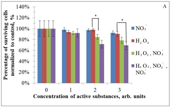 Although nitrites (NO2−) themselves do not have a damaging effect on the cells, and they even increase the vitality of mieloblastosis cells compared to the control, together with hydrogen peroxide (H2O2), they have a stronger cytotoxic effect than hydrogen peroxide alone. The addition of nitrates (NO3−) increases the cytotoxic effect further (by 30–50%). This result confirms Bauer’s studies [,], which talk about the combined action of the reactive forms of nitrogen and oxygen.