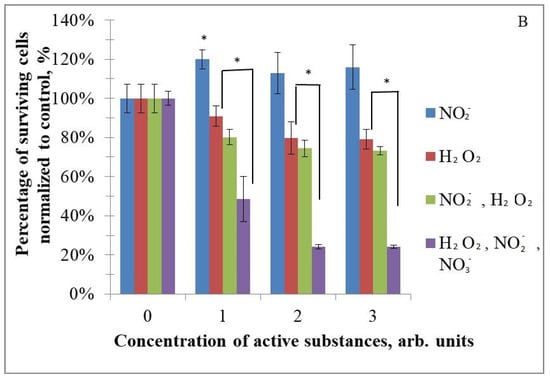 Dependence of the level of vitality of (A) conventionally healthy and (B) tumor (mieloblastosis) cells on the concentration of nitrites, nitrates, and hydrogen peroxide added to the nutritional medium. Concentrations 1–3 correspond to those in the physiological solution treated by the direct piezodischarge during 30, 60, and 90 s, respectively (1: H2O2—2.08 µM, NO2−—0.058 mM, NO3−—0.286 mM; 2: H2O2—6.91 µM, NO2−—0.091 mM, NO3−—0.378 mM; 3: H2O2—10.08 µM; NO2−—0.103 mM, NO3−—0.725 mM). An asterisk * indicates a statistically significant difference (p < 0.05) from the control, an asterisk above the frame indicates a statistically significant difference (p < 0.05) between different experimental samples. The experimental conditions are described in the Section 2.