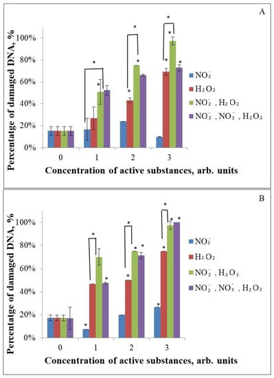 Dependence of the level of DNA damage of (A) conventionally healthy and (B) tumor (mieloblastosis) cells on the concentration of nitrites, nitrates, and hydrogen peroxide added to the nutritional medium. Concentrations 1–3 correspond to those in the physiological solution treated by the direct piezodischarge during 30, 60, and 90 s, respectively (1: H2O2—2.08 µM, NO2−—0.058 mM, NO3−—0.286 mM; 2: H2O2—6.91 µM, NO2−—0.091 mM, NO3−—0.378 mM; 3: H2O2–10.08 µM; NO2−—0.103 mM, NO3−—0.725 mM). An asterisk * indicates a statistically significant difference (p < 0.05) from the control, an asterisk above the frame indicates a statistically significant difference (p < 0.05) between different experimental samples. The experimental conditions are described in the Section 2.