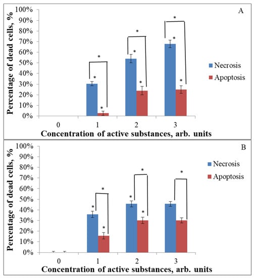 The type of cell death (apoptosis or necrosis) was defined using the acridine orange dye that details the internal structure of the cell and allows one to estimate the damage to its chromatin and cell membrane [] (Examples are given in Figure 1).
