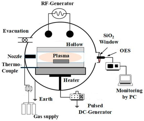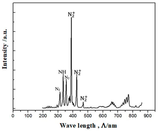 There are many plasma diagnosis tools to characterize the plasma nitriding state; e.g., electrostatic probe, optical emission spectroscopy (OES), laser-induced fluorescence (LIF), and absorption spectroscopy after [13]. Among them, OES is suitable for the diagnosis to measure the population of a species and describe various reaction processes in the plasma nitriding or surface activation process [14]. The active species such as N2, N2+, NH radical and H were detected to investigate the plasma state in nitriding [15]. In particular, those species are more activated when using a hollow cathode device, as reported in [16,17]. On the other hand, the ion and radical nitriding processes utilized the N2 + H2 gas flow rate ratio by one to three in a similar manner to use the ammonia gas (NH3) as a nitrogen and hydrogen resource [18].