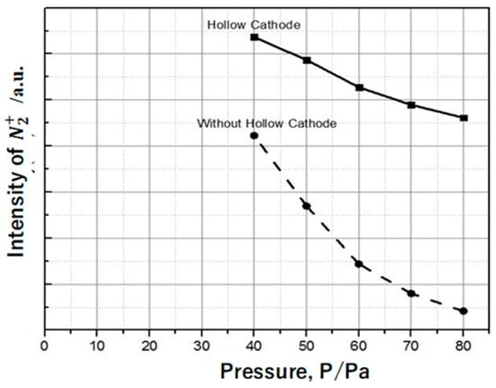 Figure 3 depicts the variation in peak intensity with the increasing pressure in the plasma diagnosis, with and without the use of the hollow cathode device. As predicted from [14,15], the ionization reaction presented in Equations (1)–(3) reduces with the increasing pressure of the N2 + H2 gas mixture. The yield of decreases monotonously with the increasing pressure. In the high-pressure range, the reaction cross-section for collision between the neutral nitrogen molecules and electrons reduces and results in less ionization. In addition, the mean free path becomes small enough to restrict electron movement. When using the hollow cathode setup, this monotonous decrease in the yield of retards by itself. As had been discussed in [16,17], this is because the generated electrons by Equations (1)–(3) are confined in the hollow.