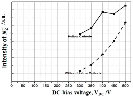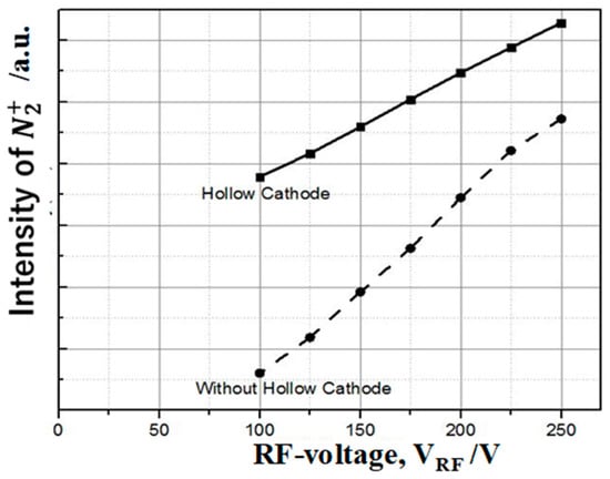 DC bias voltage was varied from −300 V to −600 V to investigate the enhancement of ionization with increasing the DC-bias. As depicted in Figure 4, the ionization process is enhanced by increasing VDC. The RF-voltage was also varied from +100 V to +250 V to describe the enhancement of ionization with increasing the RF-voltage. As shown in Figure 5, the peak intensity linearly increases with the applied RF-voltage with and without the hollow cathode. This is because the ionization reaction cross-section in Equations (1)–(3) is proportional to the RF-voltage. Hence, higher DC-bias and RF-voltage is a necessary condition in this RF-DC plasma, nitriding at a low holding temperature.