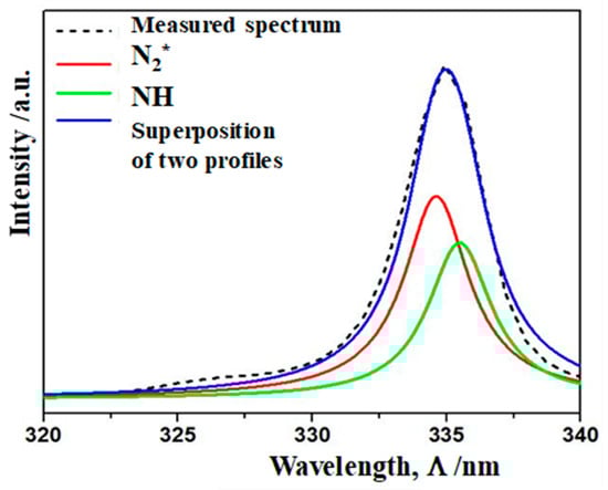The measured spectrum at Λ = 335 nm was deconvoluted to two peak profiles at Λ = 334 nm and Λ = 336 nm, respectively, as shown in Figure 6. After Table 1, the former corresponds to the activated nitrogen molecule, and the latter is identified as a NH-radical. A very tiny disagreement is noticed between the measured spectrum and the superposed profile of the two peaks; this detection of NH-radicals has sufficient reliability for usage in parametric study in the following.