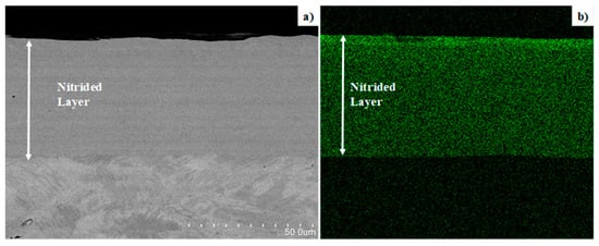SEM image on the cross-section of nitrided AISI304 substrate at 623 K for 14.4 ks and its nitrogen mapping. (a) SEM image on the cross-section, and (b) nitrogen solute mapping.