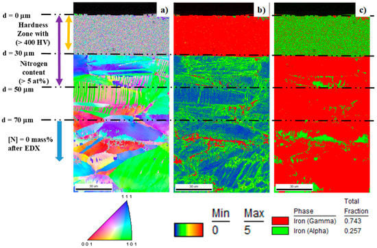 Figure 9b,c show KAM distribution and phase mapping, respectively. The refined zone in d < 30 μm in Figure 9a has the highest misorientation angle and a fine two-phase structure. This KAM in Figure 9b denotes the plastic strain distribution. The transformation from γ-phase to α-phase in Figure 9c is induced by plastic straining under the nitrogen supersaturated state. Hence, the grain size of the original AISI304 is refined by high plastic straining everywhere in d < 30 μm, so that a huge amount of grain boundaries is generated together with the γ/α- and α/γ-zone boundaries. This refined layer is just equal to the high hardness layer with a high nitrogen content.