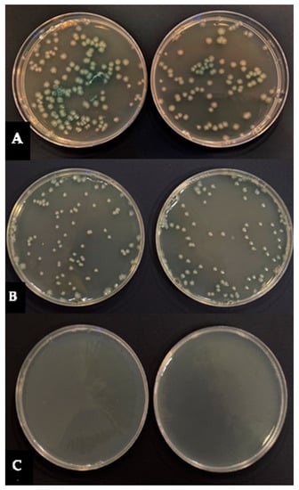 Photocytotoxic effect of Pc+ against P. aeruginosa through incubation and plate counting method. Representative plates with bacterial colonies of P. aeruginosa. (A)—number of P. aeruginosa in the control sample not containing the photosensitizer and not irradiated (L- Ps-); (B)—number of P. aeruginosa in the non-irradiated test containing the photosensitizer (dark toxicity (L- Ps+)); (C)—number of P. aeruginosa in the irradiated test containing the photosensitizer (photocytotoxicity (light toxicity) (L+ Ps+)).