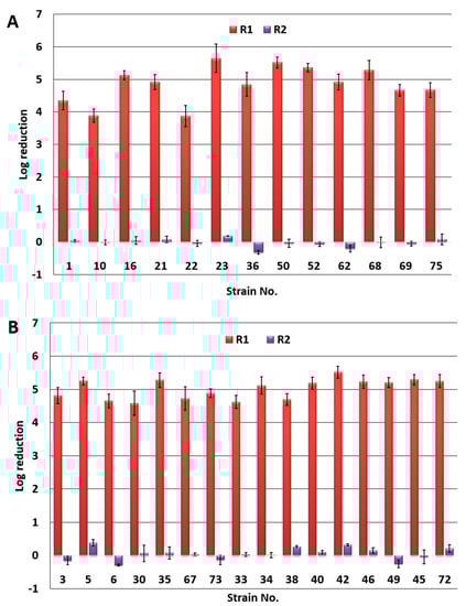 Values of reduction factors (R1 and R2) based on clinical strains of P. aeruginosa treated with Pc+ at a concentration of 1.0 × 10−4 M in the dark (dark toxicity) and after irradiation with light (photocytotoxicity): (A) photocytotoxicity and toxicity—strains isolated from lower respiratory tract; (B) photocytotoxicity and toxicity—strains isolated from chronic wounds. Abbreviations: R1—photodynamic inactivation; R2—dark toxicity; R1 = Log L(-)Ps(-)—Log L(+)Ps(+); R2 = Log L(-)Ps(-)—Log L(-)Ps(+); L(-)Ps(-)—no irradiation, no Pc+ (negative control); L(-)Ps(+)—no irradiation, Pc+ (dark control); L(+)Ps(+)—irradiation, Pc+.