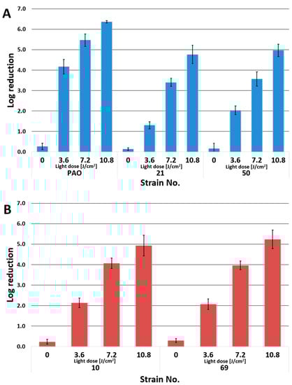 The huge threat of P. aeruginosa to human health results from its innate resistance to many antimicrobials and its unique ability to form a biofilm. Biofilms often develop on the surface of wounds and is responsible for their chronicity and also complicates treatment. In a similar fashion, infections of the lower respiratory tract develop a biofilm, which makes it important to look for substances that act not only on the planktonic forms of bacteria, but, most importantly, on biofilms. Antibiotics and antiseptics used in the treatment of chronic wound infections are ineffective as antibiofilm agents because these agents have not been designed for killing of microorganisms within a biofilm but have only been designed to specifically focus on killing microorganisms in the planktonic state [37,56,57]. What is interesting is that biofilm production is a persistence strategy of P. aeruginosa for survival. The significance of this strategy is especially highlighted in chronic infections, pneumonia in patients with cystic fibrosis, hospital-acquired pneumonia, as well as infections associated with biomedical devices such as implants or catheters [3,43,58]. Growth in the biofilm contributes to its virulence and protects bacteria not only from antibiotics, but also from disinfectants and other antimicrobials, as well as host defense systems [13,14,59]. In this study, the effect of Pc+ on P. aeruginosa biofilm was assessed. As revealed in Figure 4, after single irradiation, a decrease in the number of bacteria in biofilm varied between tested strains and was observed in the range of 1.3–4.2 log. It is worth noting that a significant bolstering of the photoinactivation efficiency against P. aeruginosa biofilms was achieved by the introduction of the second and the third irradiation step.
