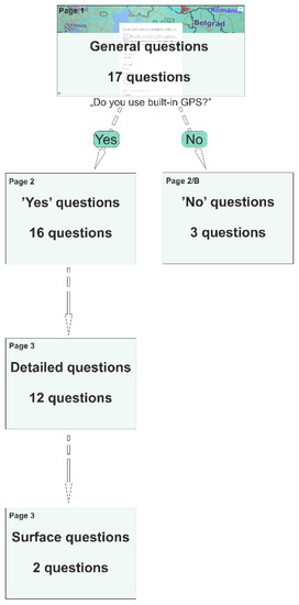 Three separate “tiles” were created for the questionnaire. General questions were asked on the first sheet. There was only one criterion to take the quiz: the respondent needed to be a driver. This section asked a total of 17 questions, about half of which concerned their background (age, gender, education, etc.), while the other half were about driving habits (e.g., how often they drive in certain circumstances, how many kilometers per year they drive). Predefined answers were given to most of these questions. We asked about the presence or use of a built-in GPS in the last two questions.