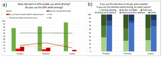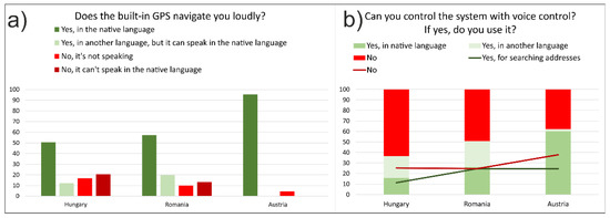 The first few questions were about the “internal” data of the built-in navigation device. Figure 3a reveals that at least half of the devices in each country speak the national language. It is remarkable that almost all Austrian drivers use these devices with the German language, while a significant percentage of respondents in the other countries use a language different from their national language (whether the system knows the national language or not). Figure 3b shows the answers to two related questions that are also related to the use of sound in the interface. Whether the system can be controlled with voice instructions is shown here. Austria leads in this category. Lines indicate how many of the voice-controlled devices are used by the drivers.