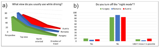 After the sound-based questions, the questions were about the system’s display. In Figure 5a, the most commonly used views can be seen. Any of the four following view options—Perspective, Top, North-oriented or Travel direction—can be selected. If it has a perspective view, it can be oriented to north or in the travel direction. Unfortunately, the respondents did not consider this point, so we received only one answer in most cases. On the other hand, it can be stated that most people chose the perspective view, but Austrians use the top view to a greater extent. The night mode is clearly not disabled by users; they are happy with this automatic feature.