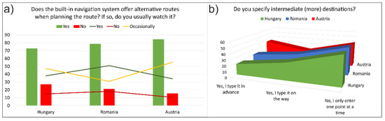 The “YES” usage path consisted of 50 questions divided into three parts (see https://mercator.elte.hu/~vorosfanni/navigation.html, accessed on 20 February 2022). The first 16 questions were general, asking for information about the system itself and the user’s relationship with it (e.g., what view they use while driving, and whether they take advantage of the ability to update the internal database for an added cost). For questions using a Likert-type scale [50], we tried to avoid the “neutral points” by using even-numbered options. We asked two questions about what they like and what they view as lacking in their navigation system. In part two, consisting of 12 questions, we asked more detailed questions. Several questions concerned frequently visited addresses and the use of GPS while driving. These questions were followed by optional questions. We did not want anyone to reach this point in the questionnaire and not submit it. These questions asked what the driver currently sees in the “map” view of his GPS and what they wanted to see. A series of options were provided but the respondent could also provide their own answer. Altogether, 1557 replies were received from the three countries. It was found that a large percentage of respondents did not use a built-in navigation system. Table 1 shows a summary of respondents who did.