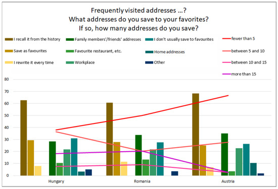 Figure 8 attempts to display three different types of data, each related to frequently visited addresses. Columns in shades of brown and yellow indicate how drivers enter locational information (from history, save as a favorite or enter again). ‘Recall from history’ dominates in all three countries, and very few (>10%) people re-enter every time. Different types of favorites are marked in shades of green. None of the six options dominate. The proportion of those who do not save addresses is around 25%. Finally, a line indicates how many addresses they have if they are saving something to favorites. Austrians saved the fewest addresses, while 30% of Hungarians and Romanians saved at least 10 points.