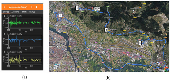 Selected data acquisition device and journey. (a) An example of a screenshot during data acquisition [53]; (b) selected 26-km journey near Bilbao, in the north of Spain.