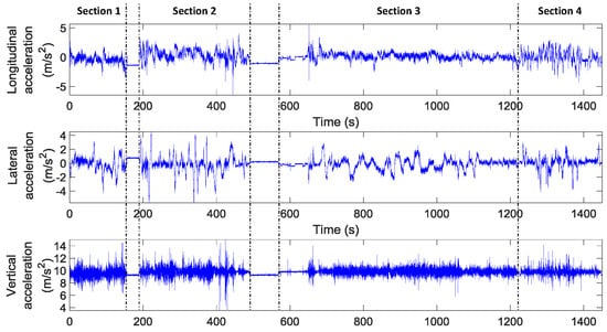 Figure 3 displays longitudinal, lateral and vertical accelerations experienced by the passengers across the representative journey. As it can be seen, there are meaningful differences among sections. For example, while section S3 (which corresponds to a highway) exhibits low accelerations in both longitudinal and lateral axes, S2 (a section with significant height differences) and S4 (an urban section) exhibit higher frequency accelerations, which are also higher in magnitude. Additionally, although the differences are smaller in the vertical axis, there are certain situations that show great values in magnitude. It has been verified that those situations correspond to zones where there are bumps.