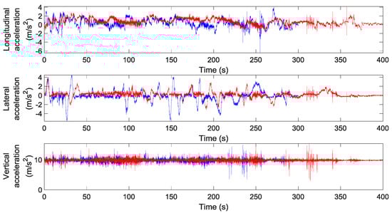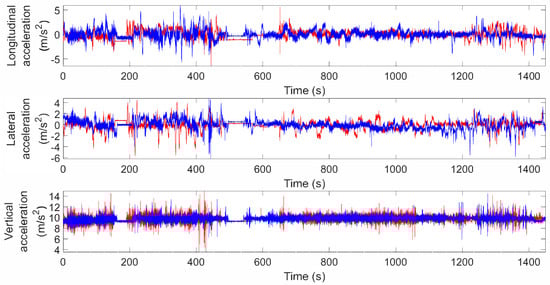 The differences in the driving style are shown in Figure 4, a representative graph where longitudinal, lateral and vertical accelerations for the same car being driven by two drivers completing Section 2 are depicted. In fact, one driver (blue) covers the journey faster (300 s) and generates more brusque maneuvers (especially in lateral axis) than the other one (red), who has a more conservative driving style and needs 100 s more to complete the section. Concerning vehicle differences, Figure 5 displays the data collected during the journey driven by the same driver and using both cars. Differences can be observed in both lateral and longitudinal directions, while the vertical accelerations remain similar.