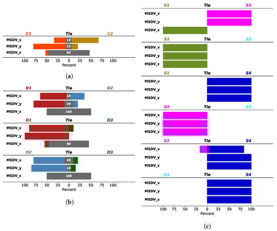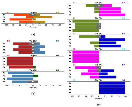 Comparison between drivers, cars and sections when , , are considered. The percentages of situations where car i exceeds car j (a); driver i exceeds driver j (b); and section i exceeds section j (c) for each particular variable.