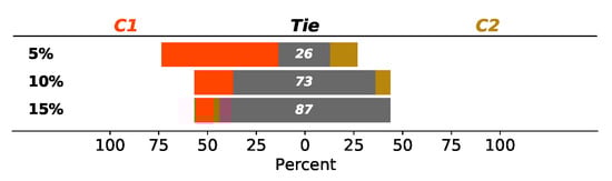 Considering this figure, taking vehicle differences into account, when comparing C1 and C2 (Figure 6a), it can be concluded that C2 exceeds the threshold in the longitudinal axis () more frequently than C1 does, but in the lateral axis (), just the opposite happens. Attending to , we cannot conclude anything, since in half of the situations, C1 outperforms C2 and the other half vice versa. Concerning , even though the greatest values are related to car C1, the differences between C1 and C2 are too small and almost all the recorded values belong to the same discomfort level. Furthermore, if the threshold to distinguish the two values increases, the percentage of times that C1 exceeds C2 decreases significantly (see Figure 7).