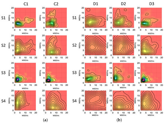 Bivariate kernel density function of the and for: (a) all sections (rows) and both vehicles (columns) when the driving style of D3 is considered; (b) all sections (rows) and all drivers (columns). The color represents the probability density, from red (improbable) to pink (probable) through yellow, green and blue. In addition, the closer the lines, the more regular the conduction is.