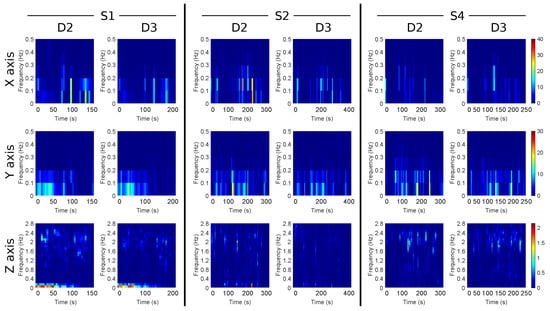 Moreover, attending to Figure 10, we can conclude that there is a common pattern during the travel both in longitudinal (x) axis and also lateral (y) axis, that is, the power tends to accumulate in the same parts of the path regardless of the driver (D2 and D3 are shown in this figure). If we pay attention to the longitudinal axis, in all sections, there are certain time instants for which both drivers have a higher power than for the rest of the section. The same occurs with the lateral (y) and vertical (z) axes, which is especially noticeable in S1, where, regardless of the driver, the greatest amount of power is gathered at very low frequencies, during the first one, and half a minute of the ride. However, the driver contributes to the magnitude of this power, which is greater for driver D2 in every case.
