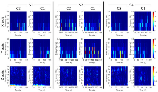 Spectrogram of the longitudinal (x), lateral (y) and vertical (z) axes (rows) of D2 and D3 drivers (columns) with C2 car when S1, S2 and S4 sections are considered (blocks).