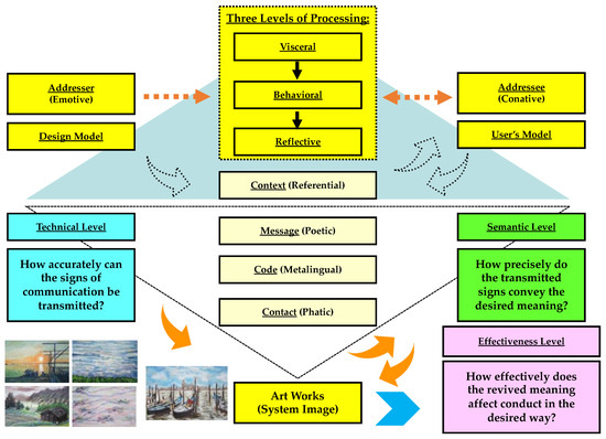 Jakobson also formulated a model of communication in which successful communication takes place through six corresponding functions: (1) the emotive function, based on the relationship between the artist and the viewer, (2) the conative function, based on the effect that the artist wants to have on the viewer, (3) the referential function, based on the actual meaning expressed in the artwork, (4) the poetic function, based on the aesthetic expression of the work of art itself, (5) the phatic function, which conveys the medium in which the work of art is communicated, and (6) the multilingual function, which confirms the coding system used for communication. The communication model based on these six corresponding factors and functions is shown in Figure 1 [24].