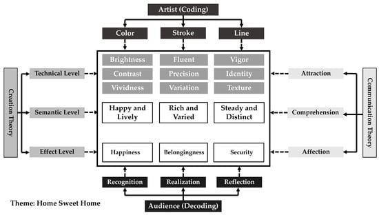 Based on Norman [28] and Lyu, Lin, and Lin [39], as shown in Figure 3, this study was divided into three main levels: the technical level, the semantic level, and the effect level. The technical level concerns the aesthetic experience of the viewer and is divided into color, brushstroke, and line. On the technical level, color is subdivided into contrast, brightness, and vividness, brushstroke is subdivided into fluency, precision, and variation, and line is divided into vigor, identity, and texture. The semantic layer concerns the conative experience of the viewer and is divided into happy and lively, rich and varied, and steady and distinct. The effect level serves as the dependent variable and concerns the viewer’s emotional experience relating to the theme of Home Sweet Home as measured by the participants’ feelings of happiness, belongingness, and security. Finally, the participants identified each painting as being produced by either a computer or by an amateur artist.