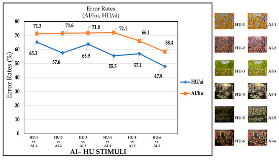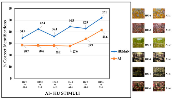The highest percentage of correct answers was for the HU-6 vs. AI-6 group, indicating that the participants’ ability to distinguish the two types of paintings improved as they went through the sequence (Figure 4 and Figure 5).