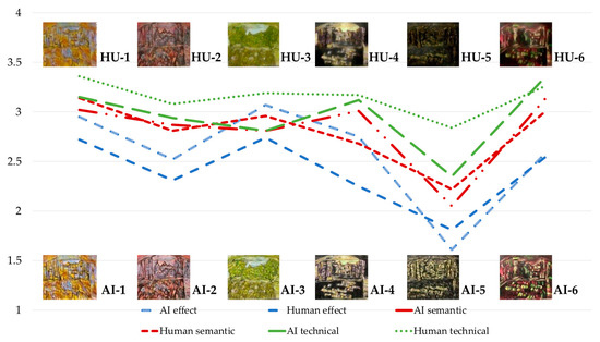 For five of the six pairs of paintings, the AI paintings were scored higher in terms of affect relating to the theme, with the AI-5 and HU-5 pair being the lone exception, indicating that the AI paintings were more effective in this respect, due to machine learning.