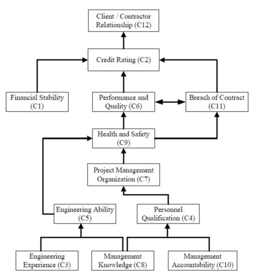 Figure 2 illustrates that engineering experience (C3), management knowledge (C8), and management accountability (C10) play significant driving roles in developing a qualified contractor, and they form the base of the ISM hierarchy. Therefore, these variables help management increase know-how, develop trust between business associates, and minimize the aversion to change. This also helps in improving personnel qualifications (C4) and engineering ability (C5). Meanwhile, client–contractor relationship (C12) and credit rating (C2) illustrate the significant dependence on other variables for contractors’ development. These variables situate close to the top of the hierarchy. A credit rating (C2) for a qualified contractor is enhanced as a result of an excellent reputation.