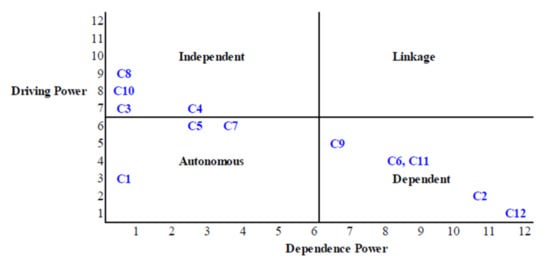 A number of previous studies integrated ISM and MICMAC to assess the criteria of multicriteria decision-making problems in construction-related fields, to rank the alternatives or select the most suitable alternative [45,46,47]. MICMAC was proposed to handle complicated problems [35]. It comprises four clusters according to two factors: driving power and dependence power. A variable shows driving power if its action might drive the variables before it and significantly impact the system. Meanwhile, if the action of a variable depends on other variables, this variable presents dependence power. The fourth cluster contains independent factors having hefty driving power but weak dependence. The driving power-dependence matrix discloses the following results:
